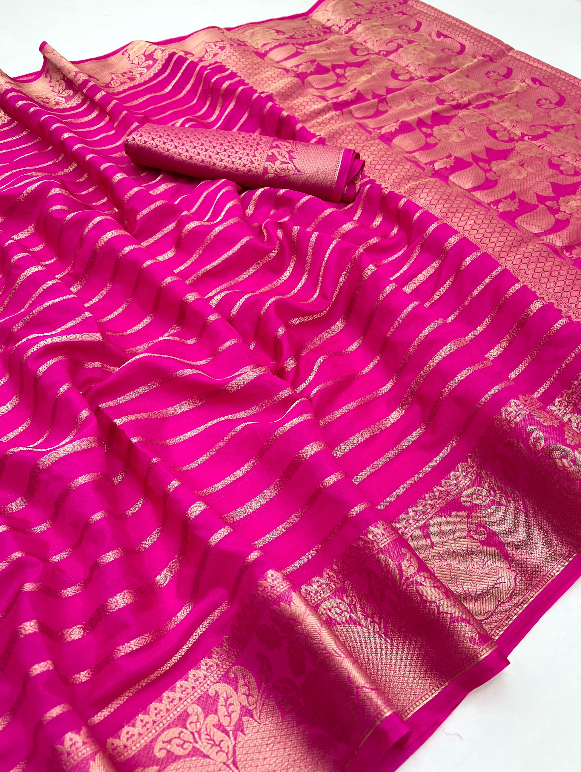 Pure Soft Georgette Fabric Weaving Saree With Finest 3 Copper Zari Wooven Pallu With Fancy Tassels n Zari Wooven Border With DESIGNER Body Weaving in Saree Having Running Barcode Butti Blouse